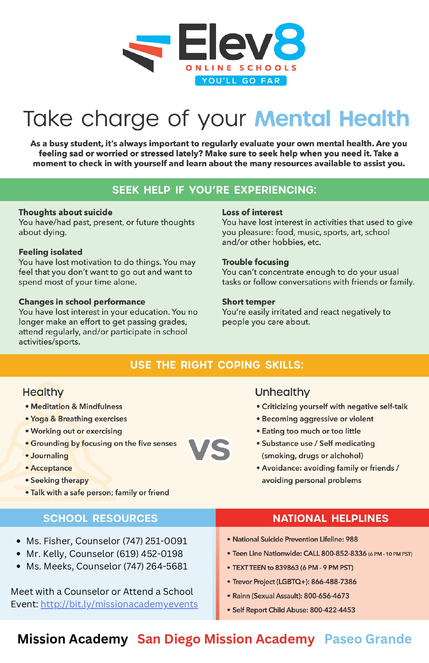 Per Education Code Section 48980 (AB 2022), we are required to notify you in writing on the ways to access mental health services and the resources that are available to you on campus and/or in the community. The mental health of you/your student is very important to us and as always, we are ready to work with you to assist in addressing the social-emotional needs or concerns of your student. Below are local resources that may be available to you and your student should the need arise. Please keep us informed as appropriate so that we can assist you in caring for and providing services to your student.